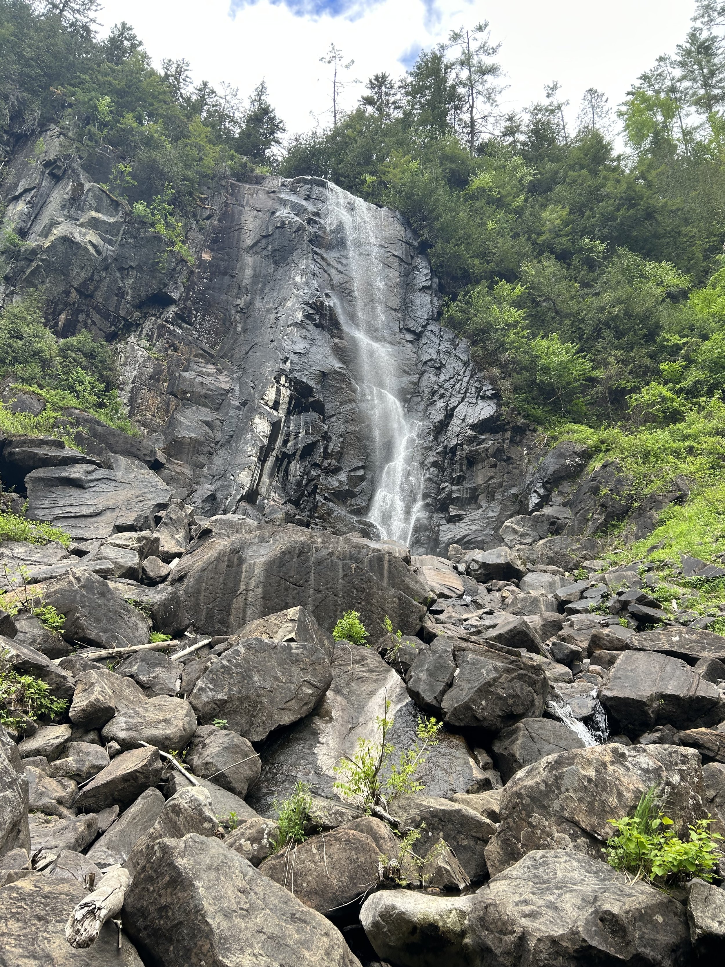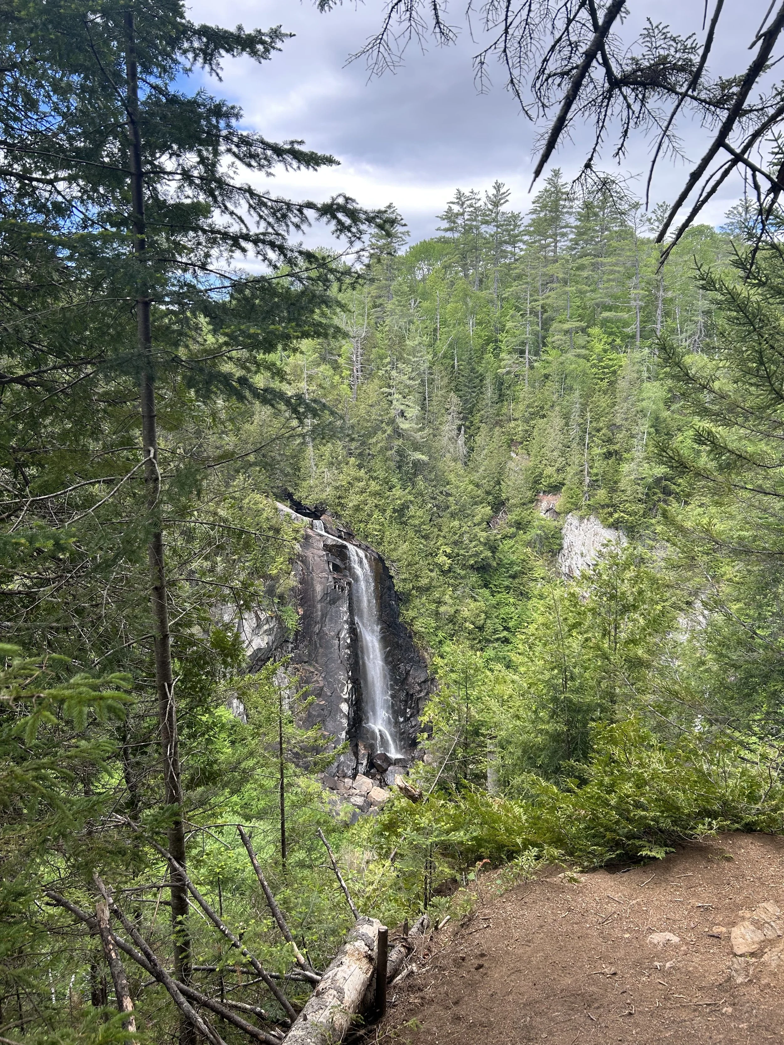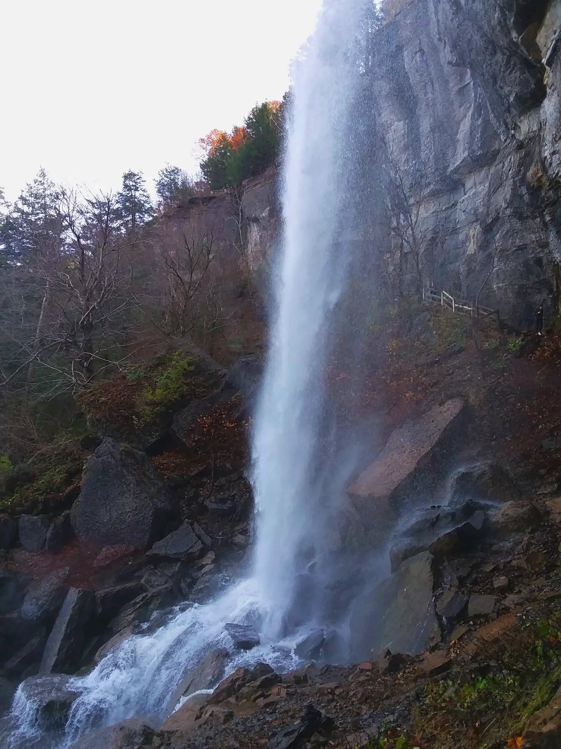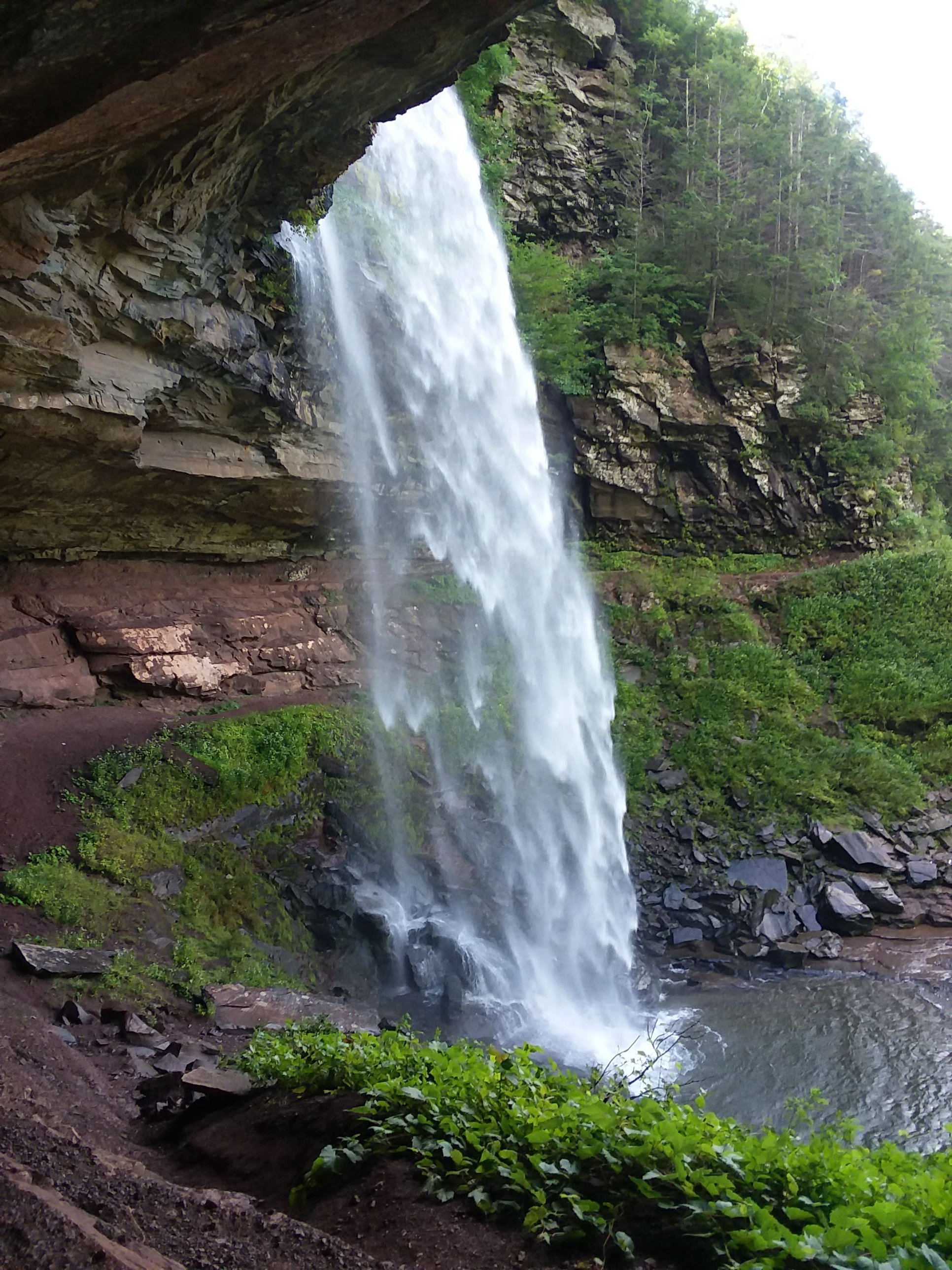 It's basically a roadside waterfall that doesn’t have a proper hiking trail, but you will have to hike down a rather steep hill through the woods to get down to the falls.