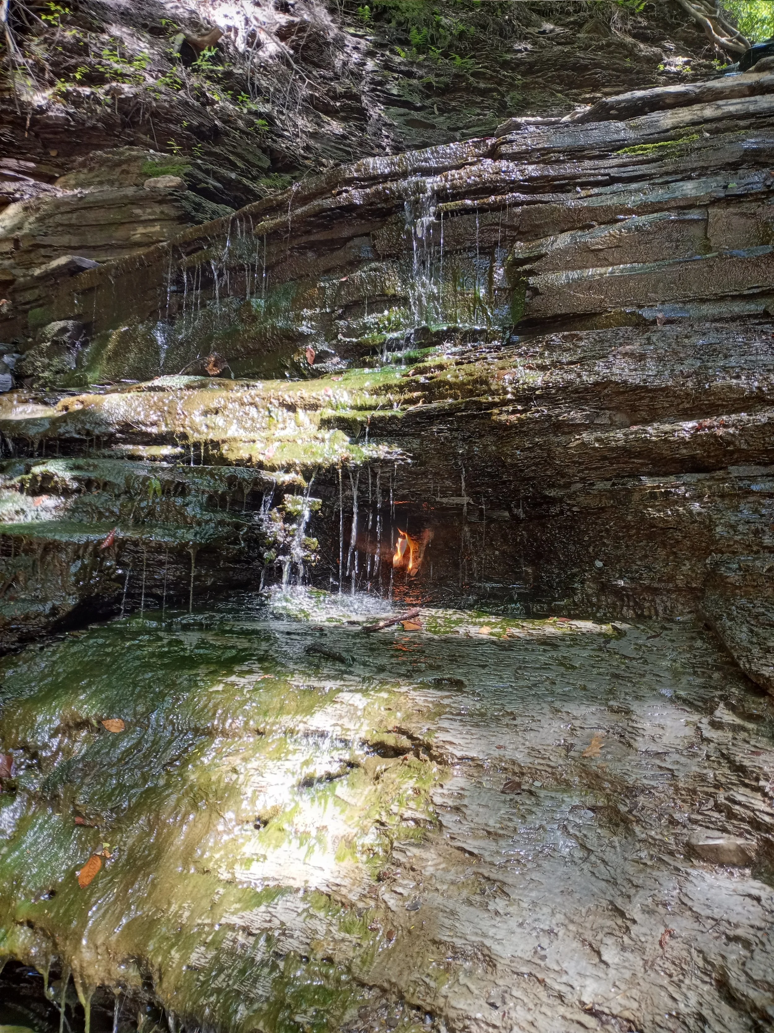 Behind this tiny waterfall is a small hole that emits natural gas. When lit, a flame appears.