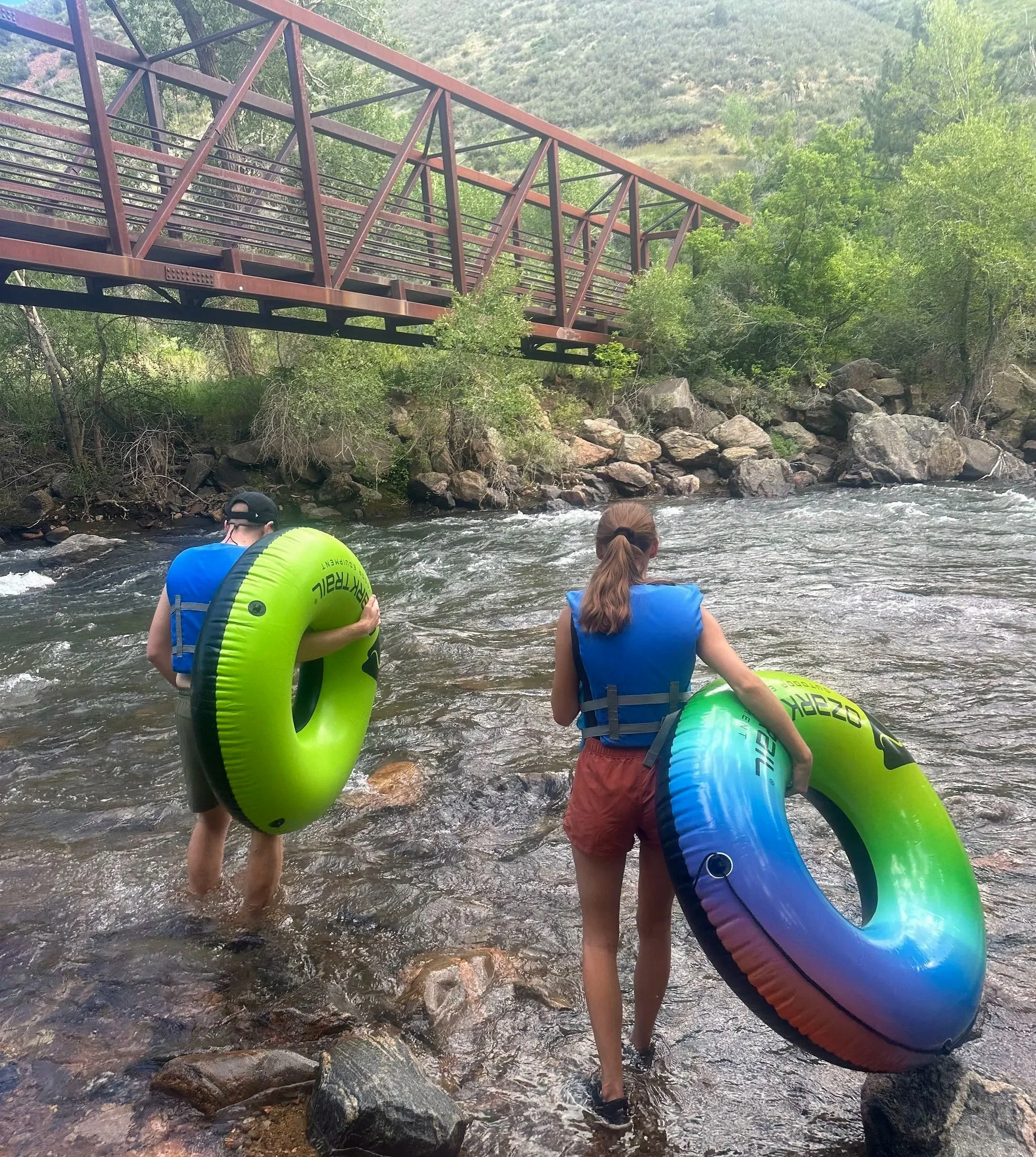 After you check-in and sign a waiver, a shuttle bus will pick you up from there and will drop you off at the Clear Creek Canyon Park, Gateway Trailhead lower parking lot with your tubes. To get to the creek, you’ll walk down two flights of stairs and walk toward the footbridge. Put in spots are marked with signs, however the tubing company does not allow you to put in further up the canyon.