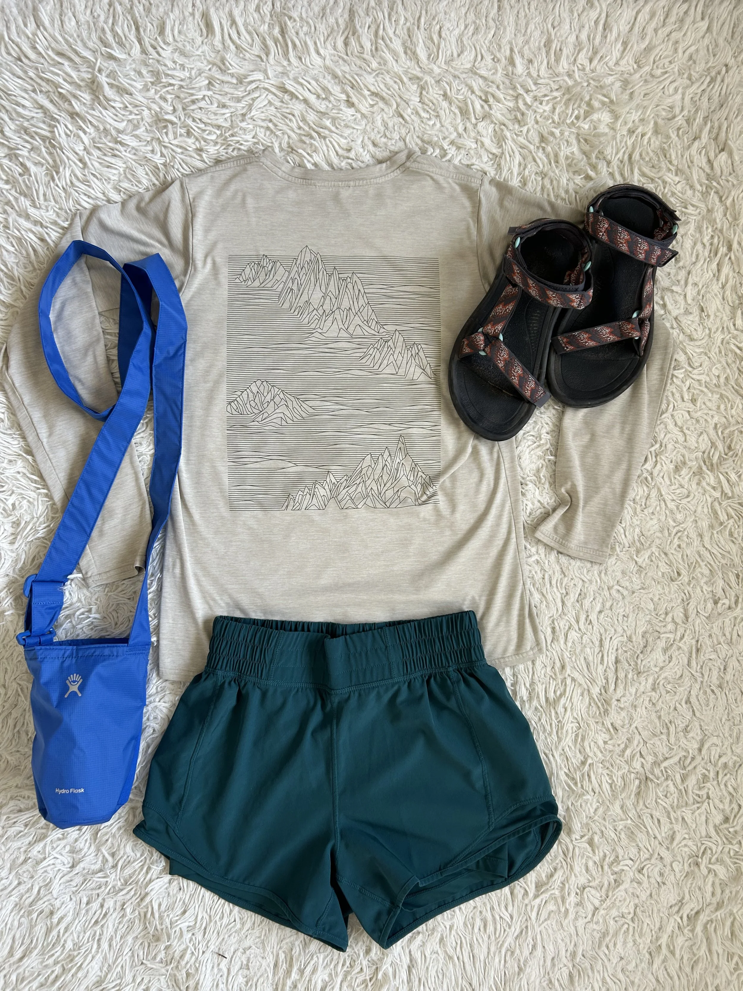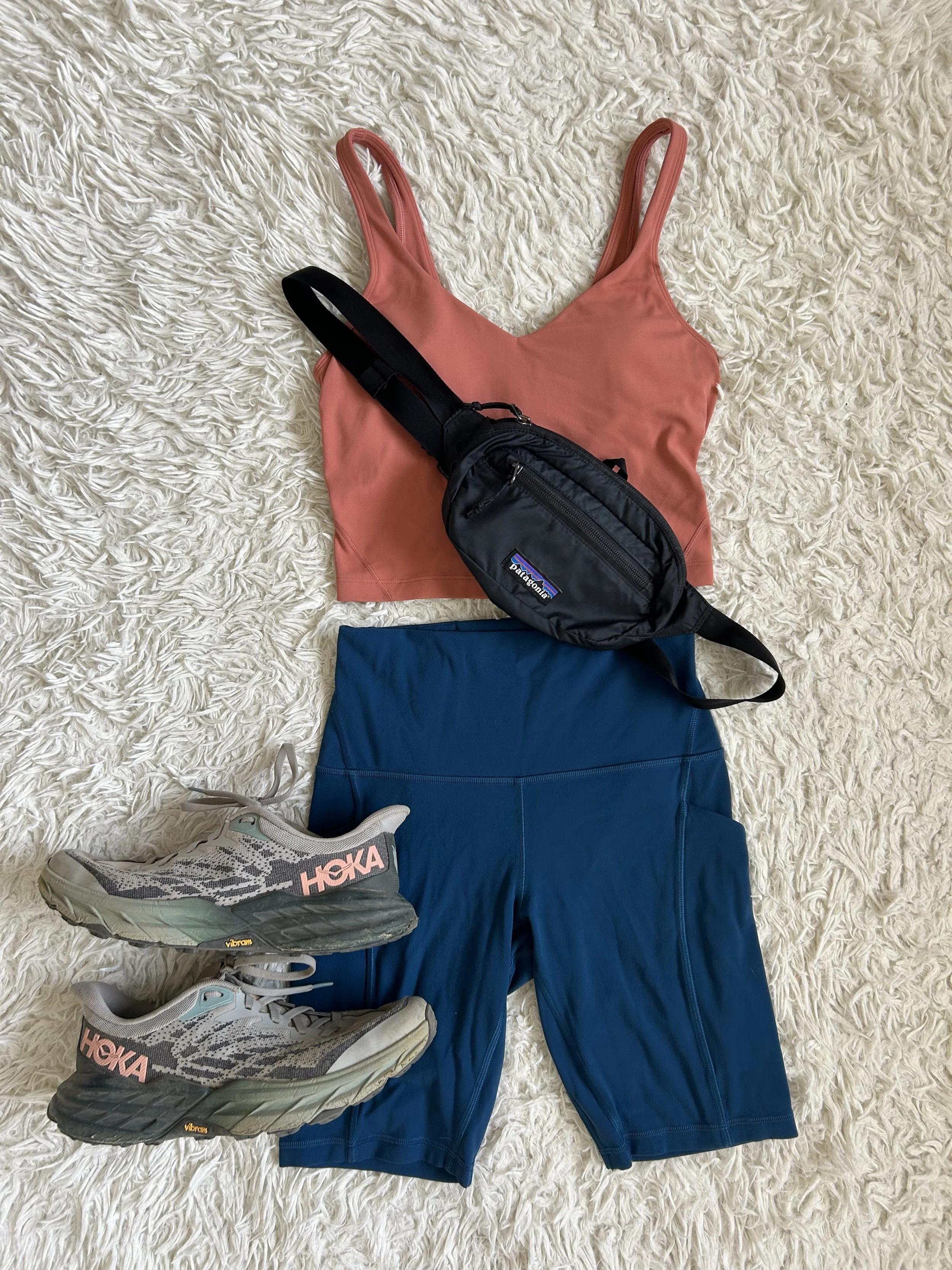 Why this outfit is a hiking essential: I love this outfit because it’s perfect for staying cool and looking cool out on the trails. The align tank top is one of my favorites because it has a built in sports bra so you can feel supported and not have to wear additional layers underneath. Biking shorts with pockets are a must for me, especially while hiking. They provide easy access to your phone, keys, and snacks without having to go into your backpack. For shoes, trail runners have been a game changer for me. I used to only wear hiking boots, which have their strength, but sometimes a bulky boot isn’t necessary. I now prefer my Hoka’s for short, non-technical hikes. And lastly, I’ve become obsessed with my mini Patagonia cross body bag when I go on easy, short hikes. It’s tiny, but is big enough to carry the essentials like keys, wallets, and other small items I want to have on me.
