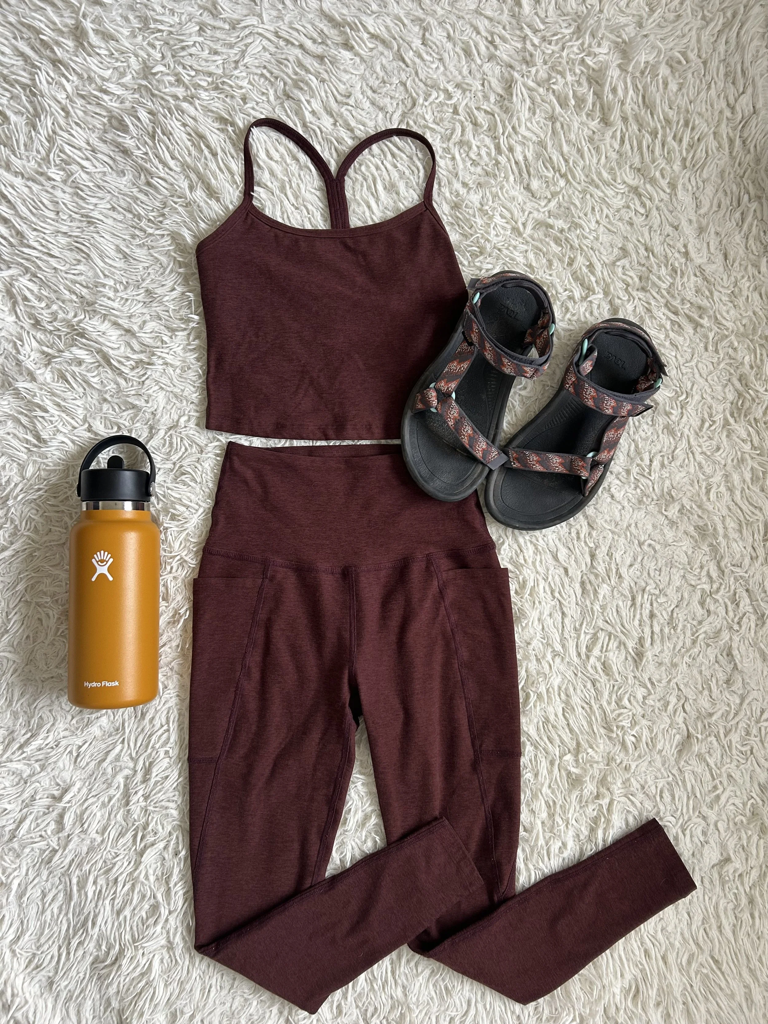 Why this outfit is a hiking essential: Beyond Yoga has some of the best sets, in my opinion, and this one is at the top. I love the earth tone red, a color that looks really good when you’re out in nature. The material is soft and breathable. It pairs nicely with a pair of Teva sandals, some of the best hiking sandals on the market. The Teva Hurricane model is great because it’s made with durable material that’s meant for the outdoors and has great traction. Always bring water with you on the trail, no matter what. A Hydro Flask water bottle is an excellent choice because holds 32 oz of water, keeps it cold, and has a handle which makes it really easy to carry. They have so many fun colors you can choose from online.