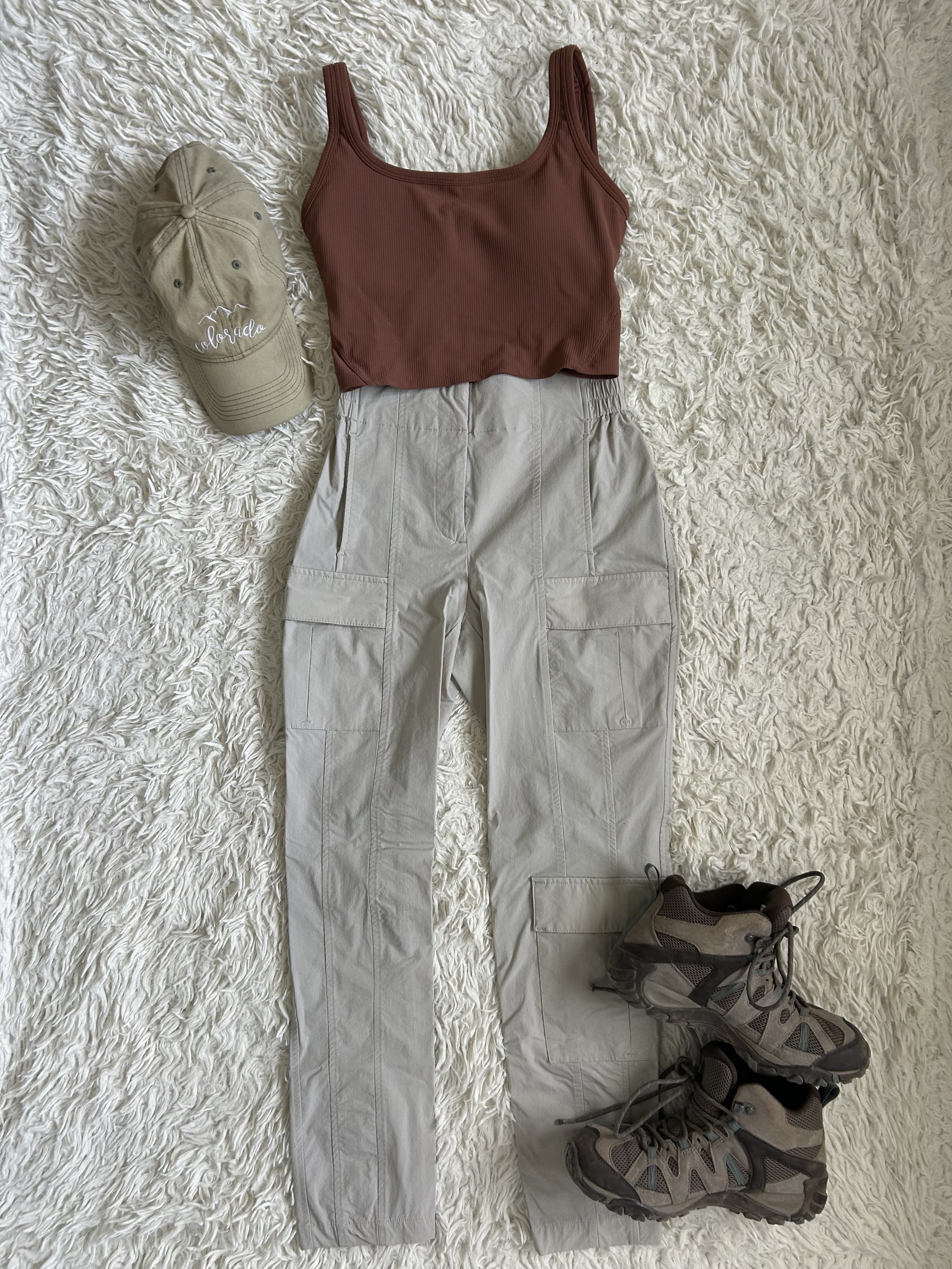 Why this outfit is a hiking essential: This is another great hiking outfit that is both functional and fashionable. The cropped tank provides support and style, while the cargo pants provide protection from the natural elements. I love the pants because they are lightweight, breathable, and have lots of pockets for storage. For hiking boots, my shoe of choice has always been Merrell. They make great hiking boots that last a long time and can handle the wear and tear you’ll get as a regular hiker. Make sure you get the waterproof version that will keep your feet dry if you’re hiking through puddles, river crossings, or if it rains.
